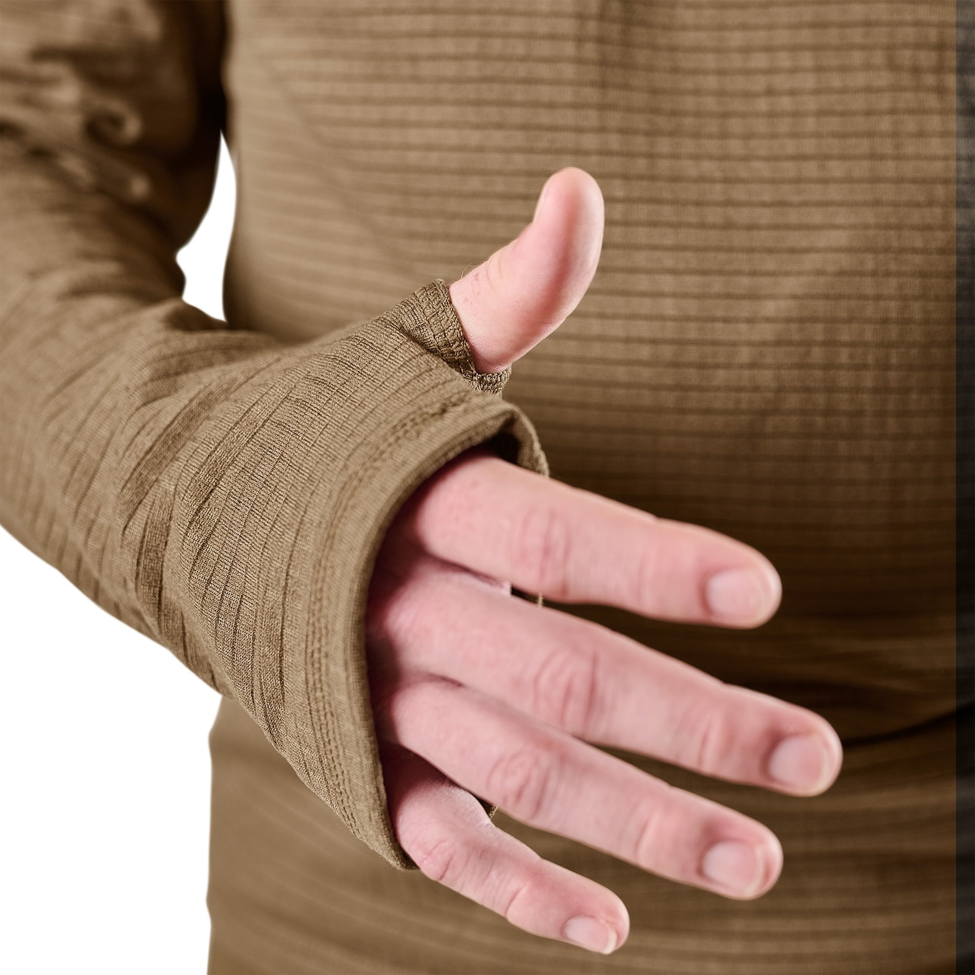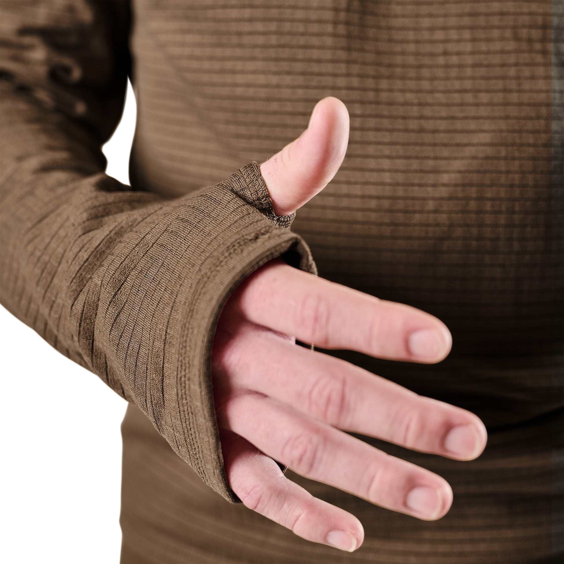 - Thumb-holes at sleeve cuffs to anchor the layer and support mobility under gear